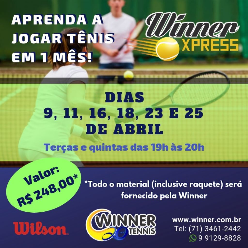 A Winner Tennis realizará agora neste mês de abril mais um curso para quem deseja começar a praticar esse esporte fantástico. Denominado Winner Xpress, o curso tem duração de 6 horas e pretende fazer com que o futuro tenista tenha as noções preliminares do esporte e sinta como é gostoso, saudável e divertido jogar tênis.