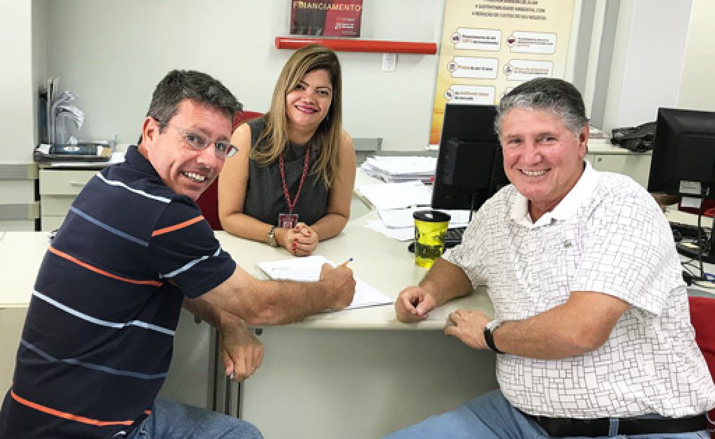 Na foto, Ary Godoy e Paulo Mondini assinam o contrato com a gerente Emilia dos Santos Ferreira, gerente da Agência Barra do banco.